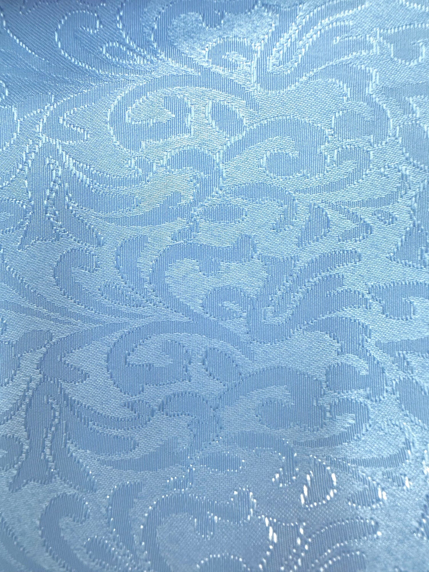 A beautiful, baby blue, floral brocade fabric. It is great for apparel, drapery, and much more. 100% polyester. High quality. Sold by the yard. (1 yard= 36 in.) Width is 60 in.