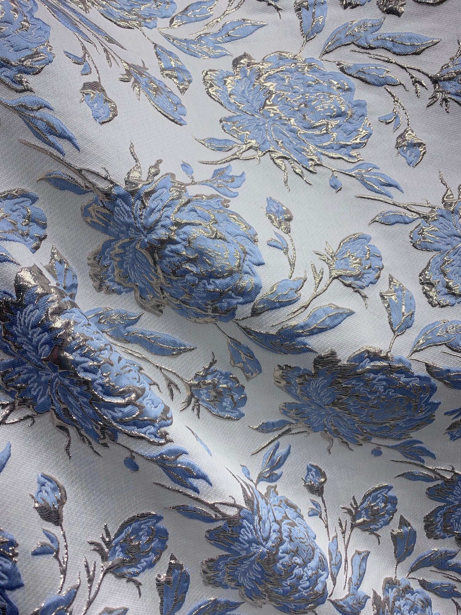 A beautiful, baby blue and gold, floral brocade fabric. It is great for apparel, drapery, and much more. High quality. Sold by the yard. (1 yard= 36 in.) Width is 60 in.