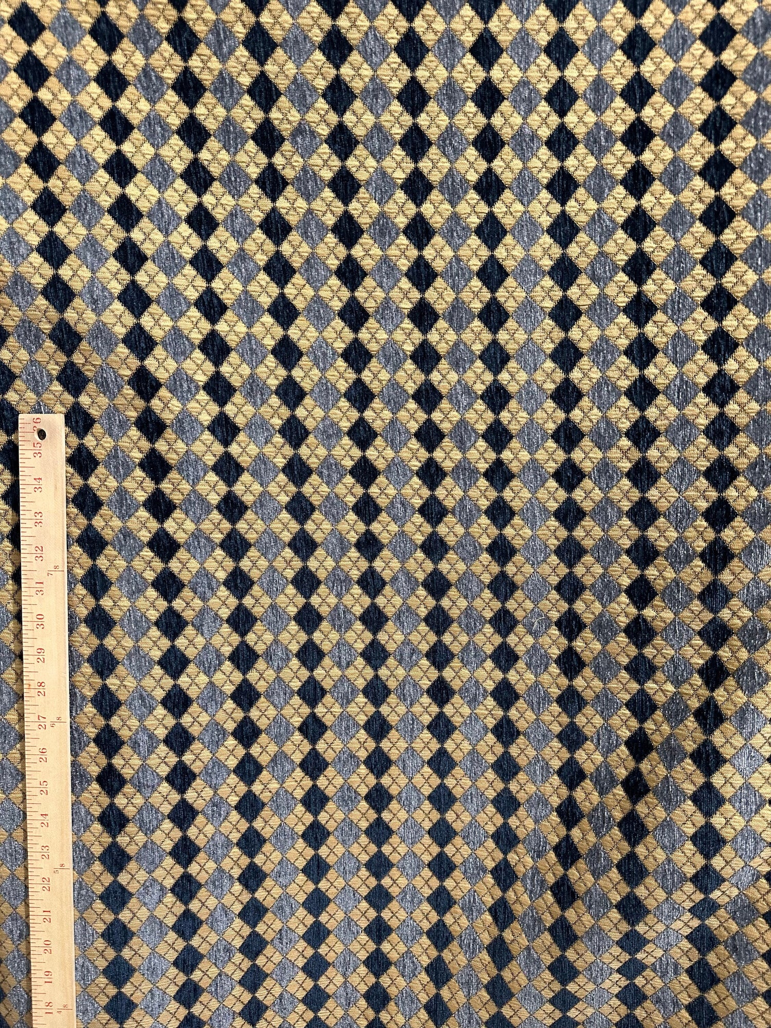 A beautiful, blue and beige, diamond chenille upholstery brocade fabric. Super high quality. Sold by the yard. (1 yard= 36 in.) Width is 56 in.