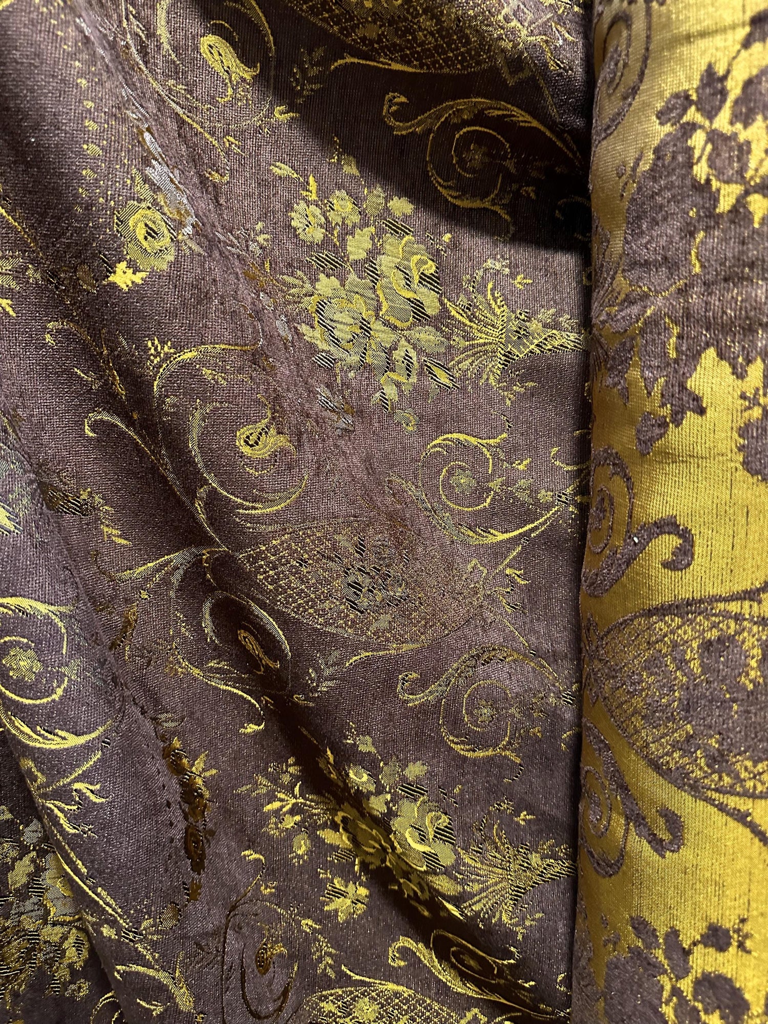 A stunning, brown and gold, floral damask chenille upholstery & drapery fabric. Super high quality. Sold by the yard. (1 yard= 36 in.) Width is 54 in.