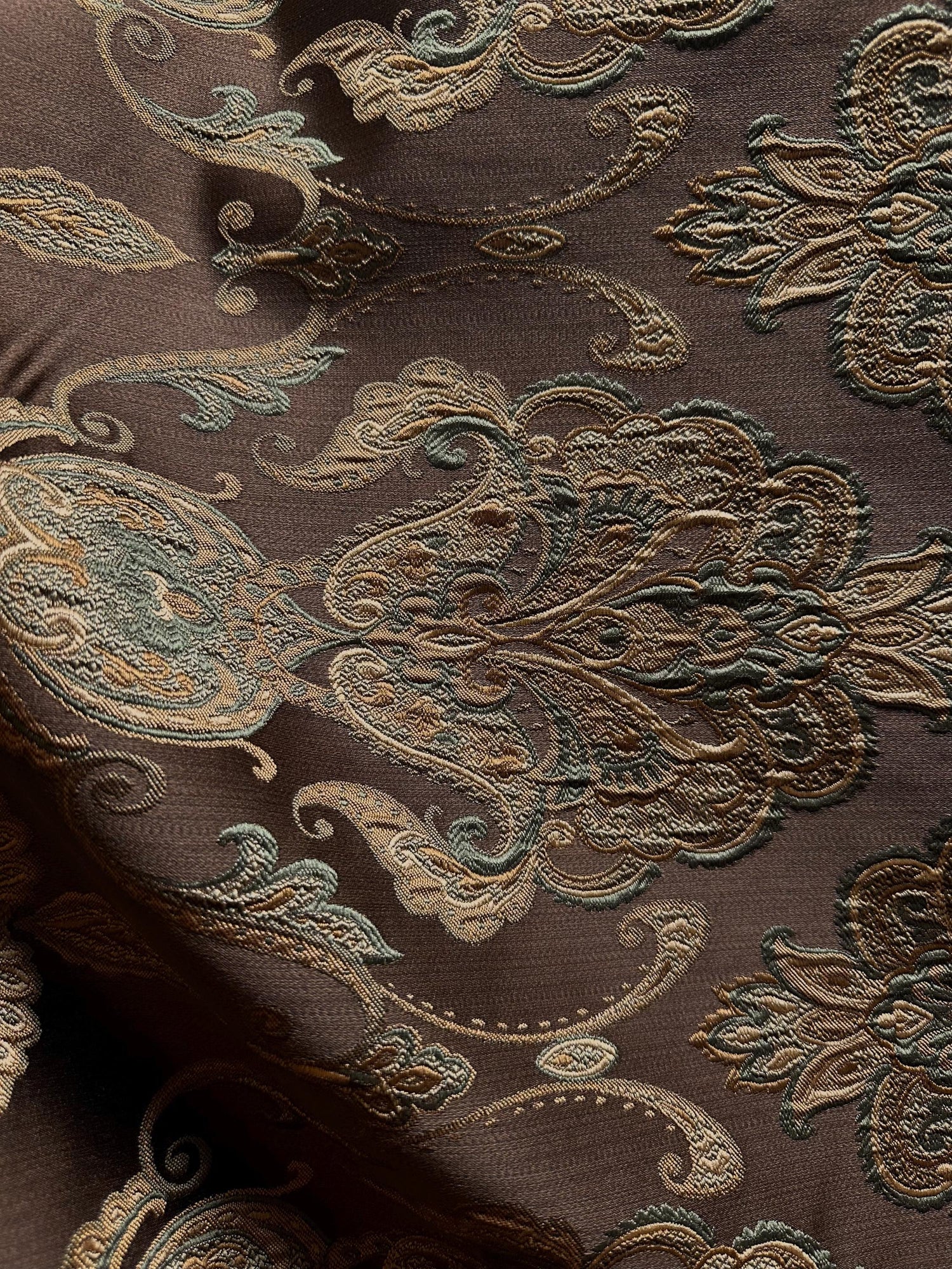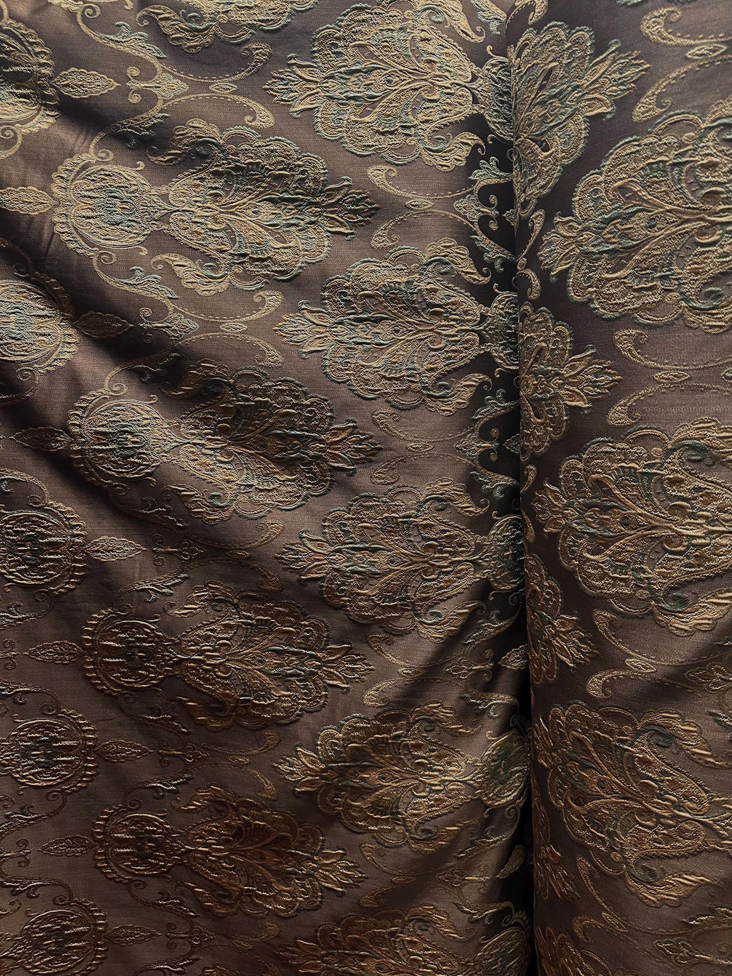 A beautiful, brown, gold and green, medium weight, damask upholstery and drapery brocade fabric. It is great for curtains, drapery, upholstery, wall coverings, and other crafts projects. High quality. Sold by the yard. (1 yard= 36 in.) Width is 110 in.