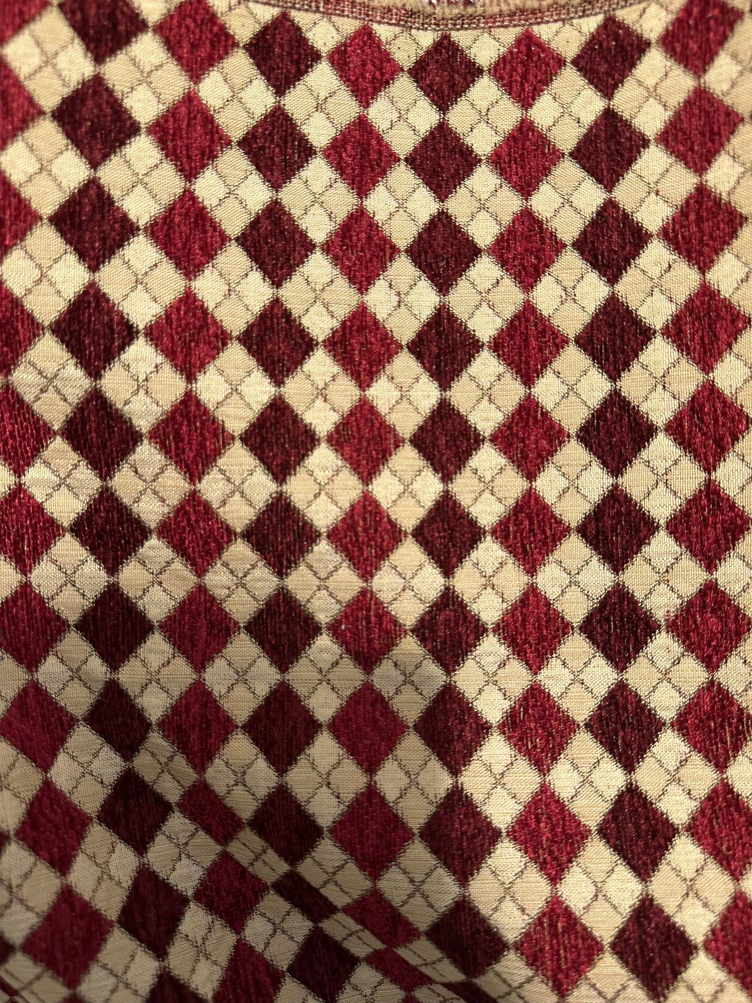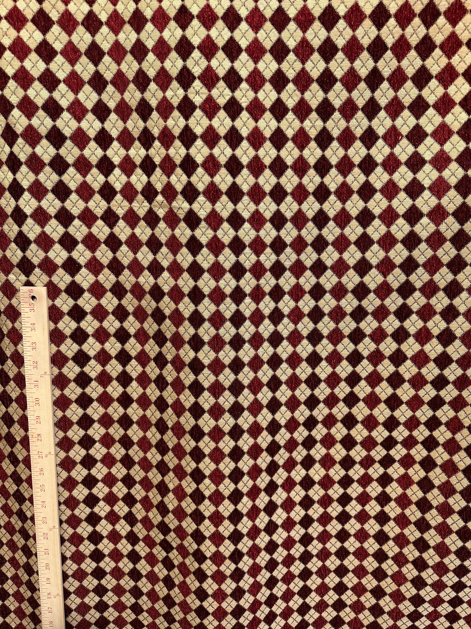 A beautiful, burgundy and beige, diamond chenille upholstery brocade fabric. Super high quality. Sold by the yard. (1 yard= 36 in.) Width is 56 in.