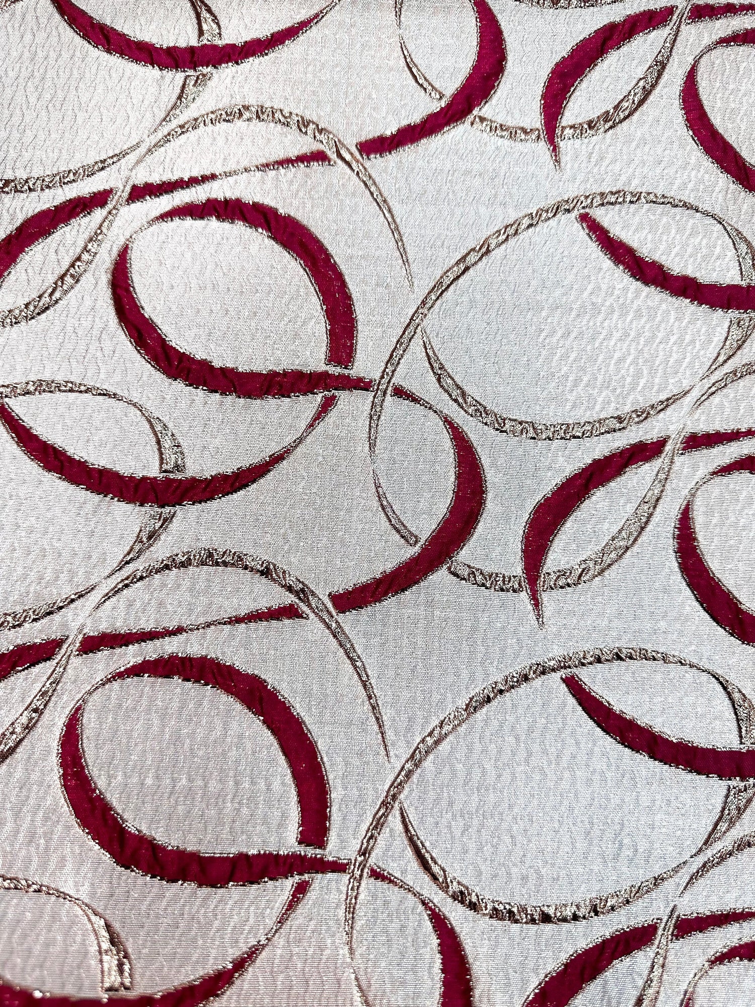 A beautiful, burgundy and gold, swirl pattern metallic brocade fabric. It is great for apparel, drapery, and much more. High quality. Sold by the yard. (1 yard= 36 in.) Width is 60 in.