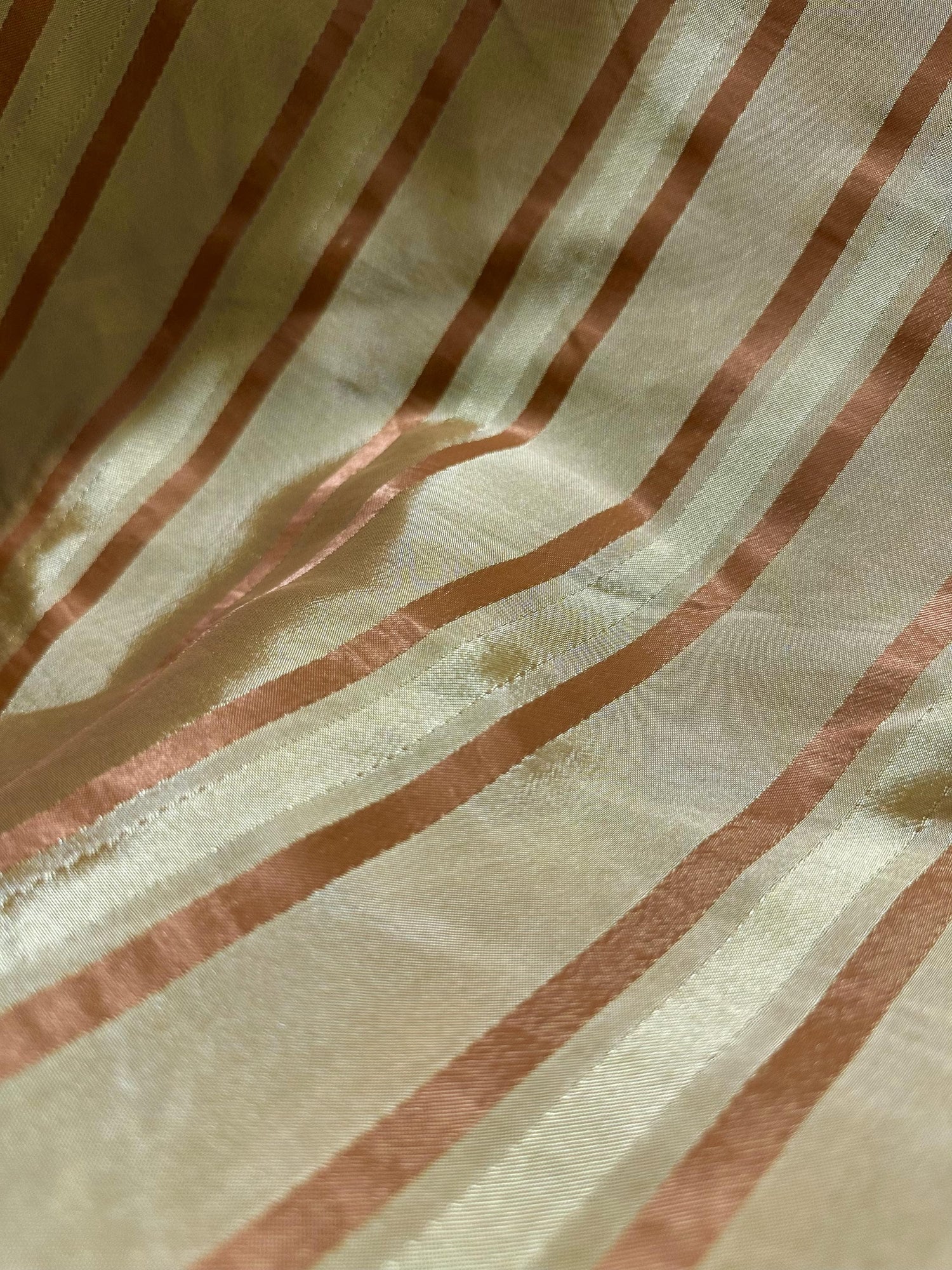 A beautiful, champagne gold and copper, striped taffeta fabric. High quality. Light-weight. Sold by the yard. (1 yard= 36 in.) Width is 54 in.