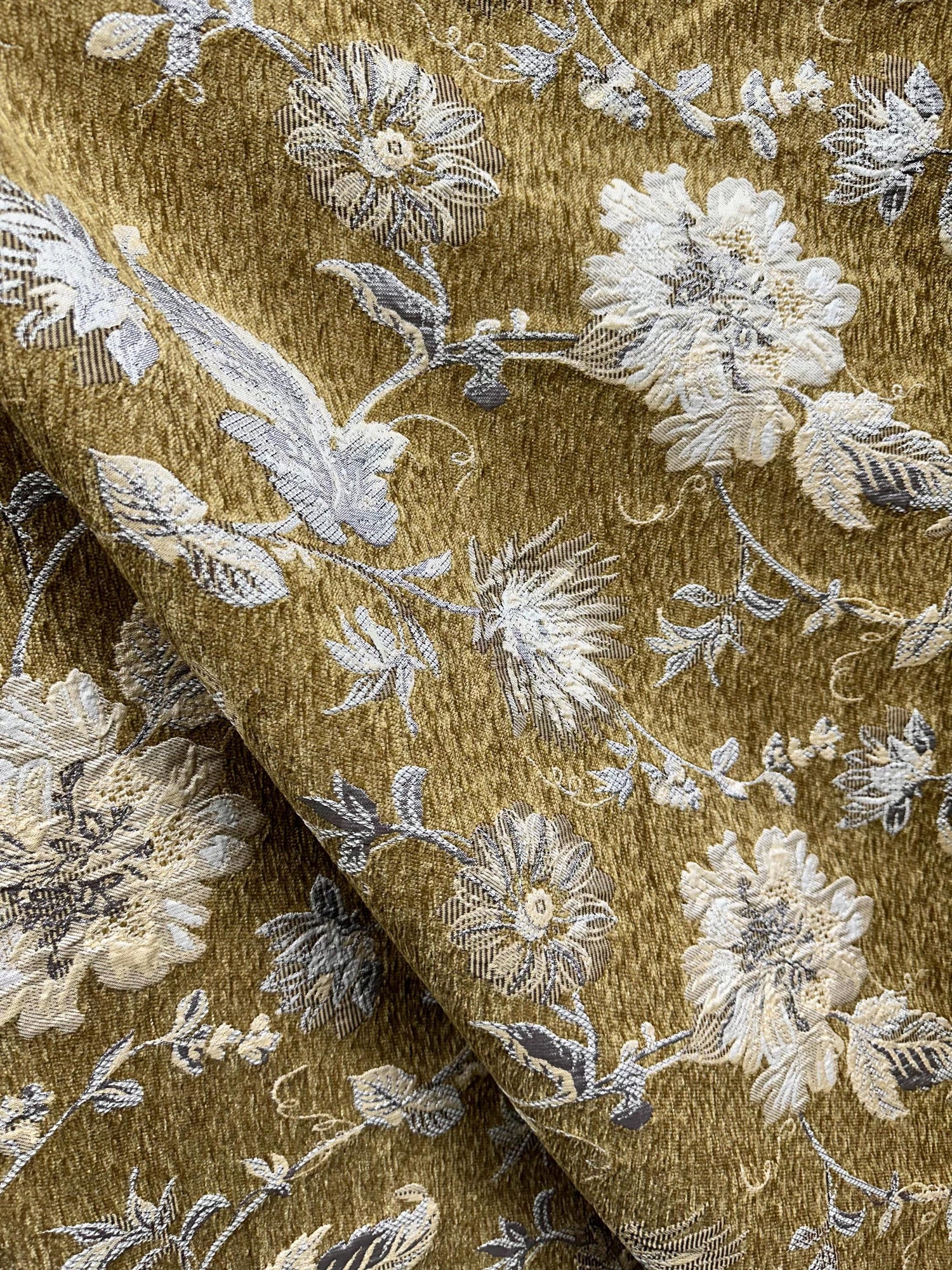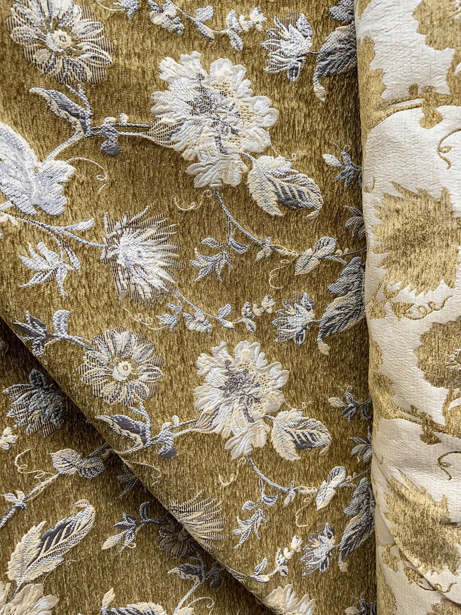 A beautiful, dark gold and beige, floral chenille upholstery fabric. High quality. Sold by the yard. (1 yard= 36 in.) Width is 54 in.