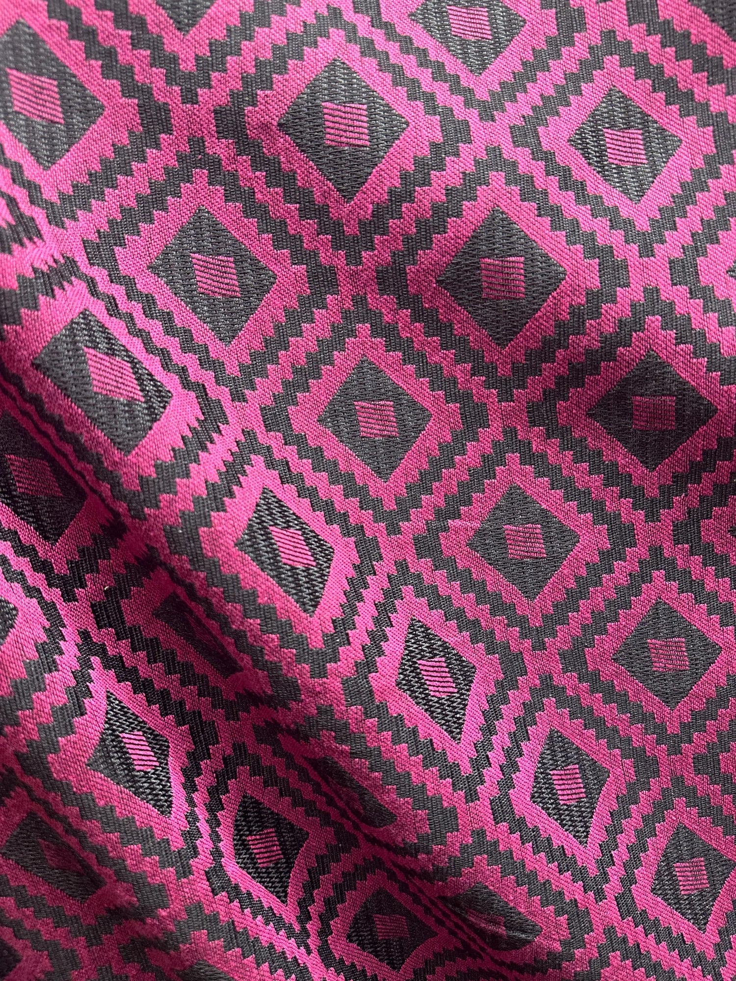 A stunning, fuchsia pink and dark gray, upholstery brocade fabric with a diamond pattern. High quality. Sold by the yard. (1 yard= 36 in.) Width is 56 in.