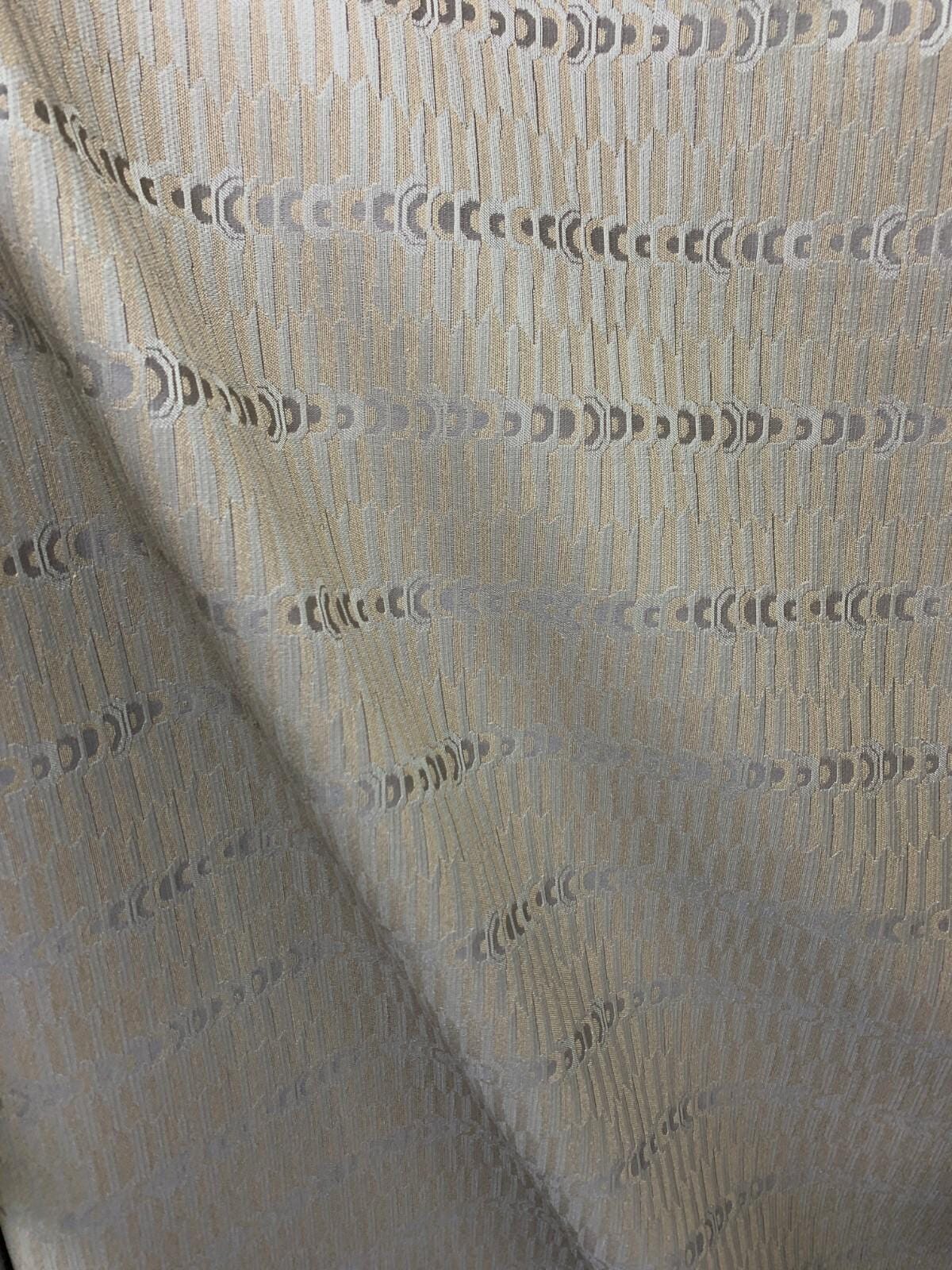 A beautiful, gray and beige, upholstery brocade fabric with a geometric pattern. High quality. Sold by the yard. (1 yard= 36 in.) Width is 54 in.