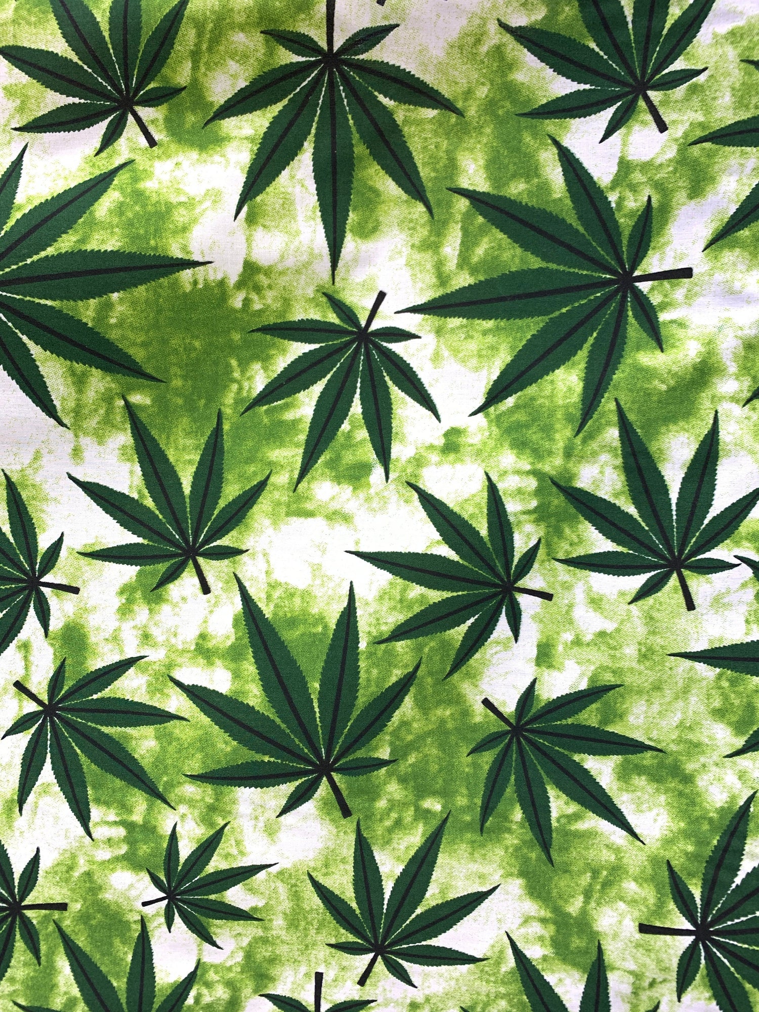 A beautiful, green and white, polyester cotton fabric with a marijuana cannabis leaves print. High quality. Sold by the yard. (1 yard= 36 in.) Width is 58 in.