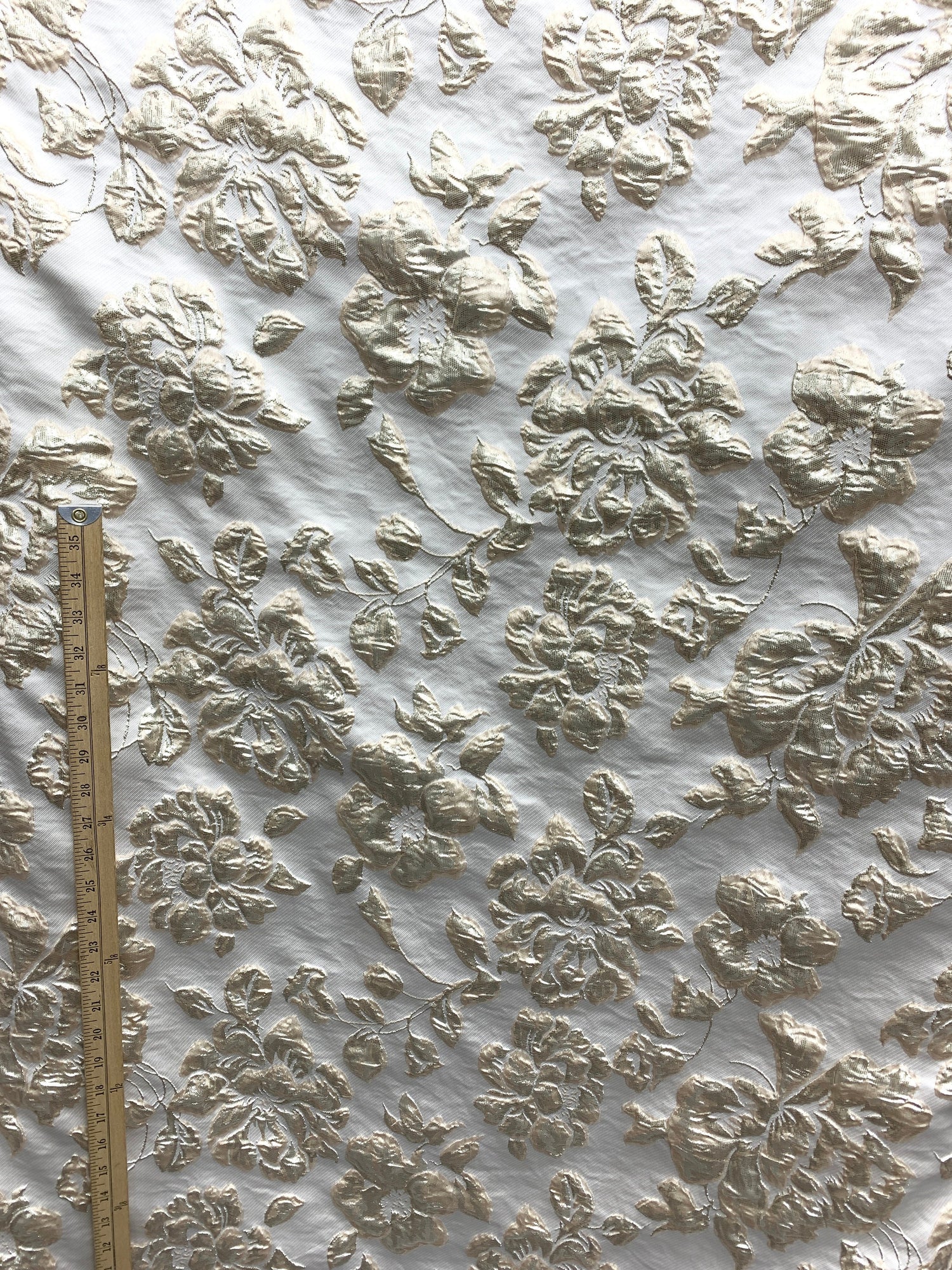 A beautiful, ivory and gold, floral brocade fabric. It is great for apparel, drapery, and much more. High quality. Sold by the yard. (1 yard= 36 in.) Width is 60 in.
