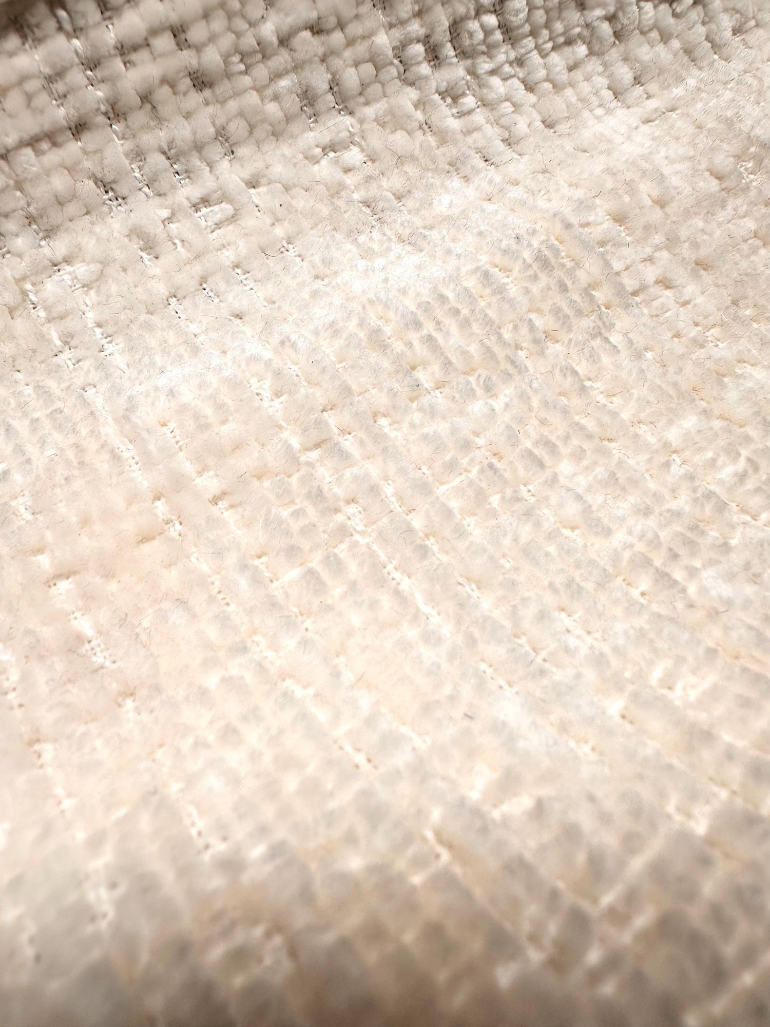 A beautiful, ivory, soft chenille velvet upholstery fabric with a textured quality. Super high quality. 100% polyester. Sold by the yard. (1 yard= 36 in.) Width is 56 in.