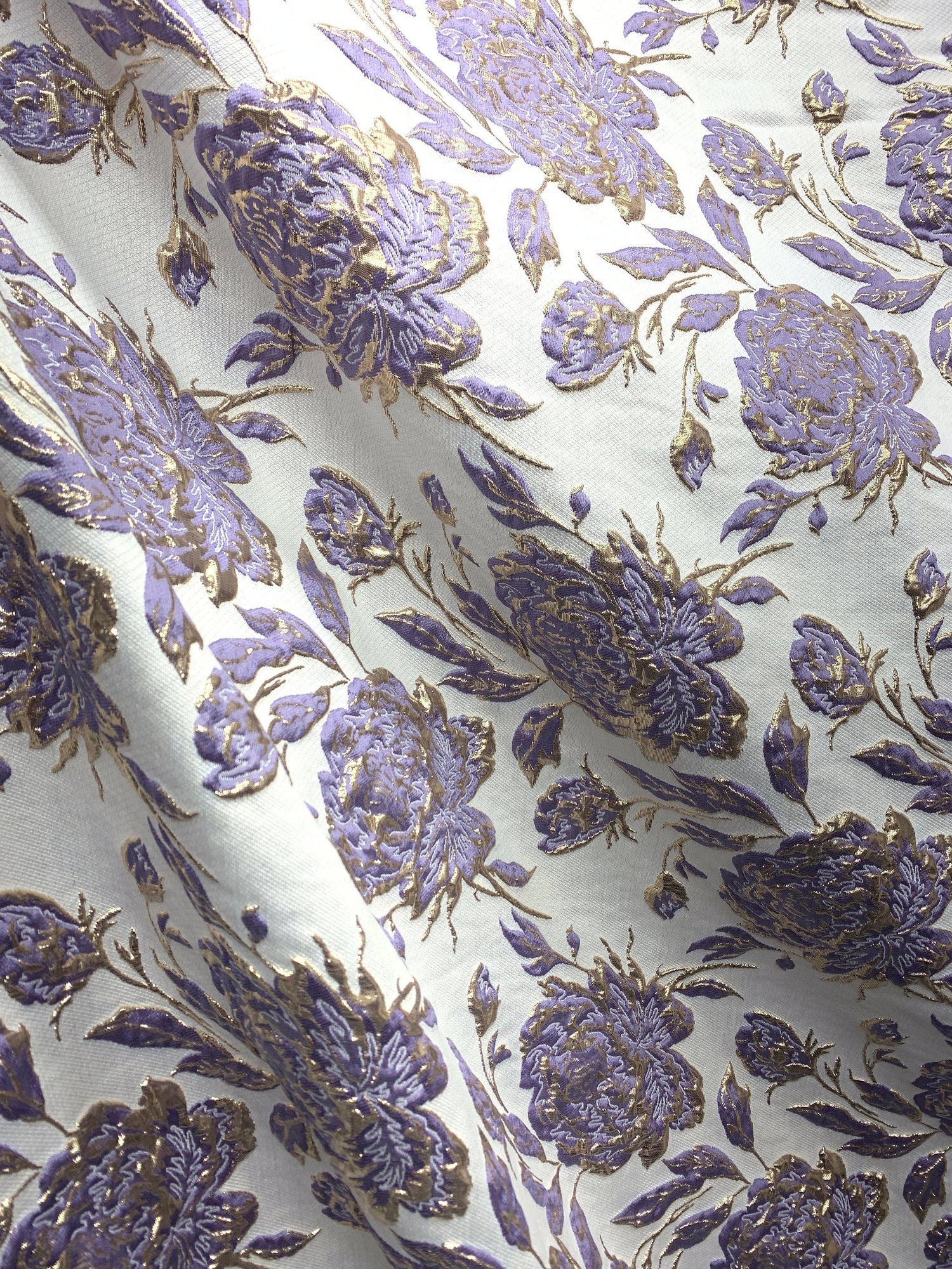 A beautiful, lavender and gold, floral brocade fabric. It is great for apparel, drapery, and much more. High quality. Sold by the yard. (1 yard= 36 in.) Width is 60 in.