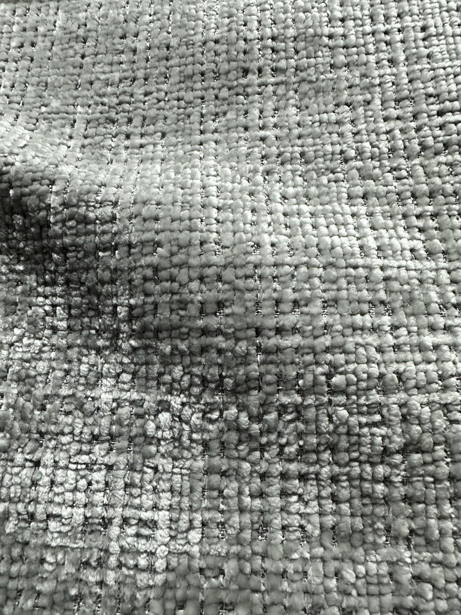 A beautiful, light gray, soft chenille velvet upholstery fabric with a textured quality. Super high quality. 100% polyester. Sold by the yard. (1 yard= 36 in.) Width is 56 in.
