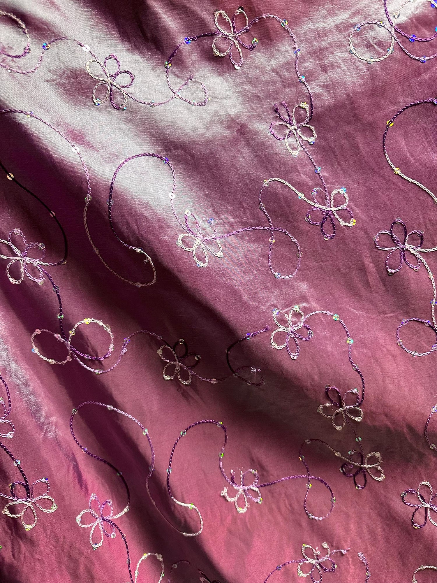 A beautiful, magenta blue two tone, polyester taffeta fabric with an embroidered sequins floral pattern. High quality. Sold by the yard. (1 yard= 36 in.) Width is 60 in.