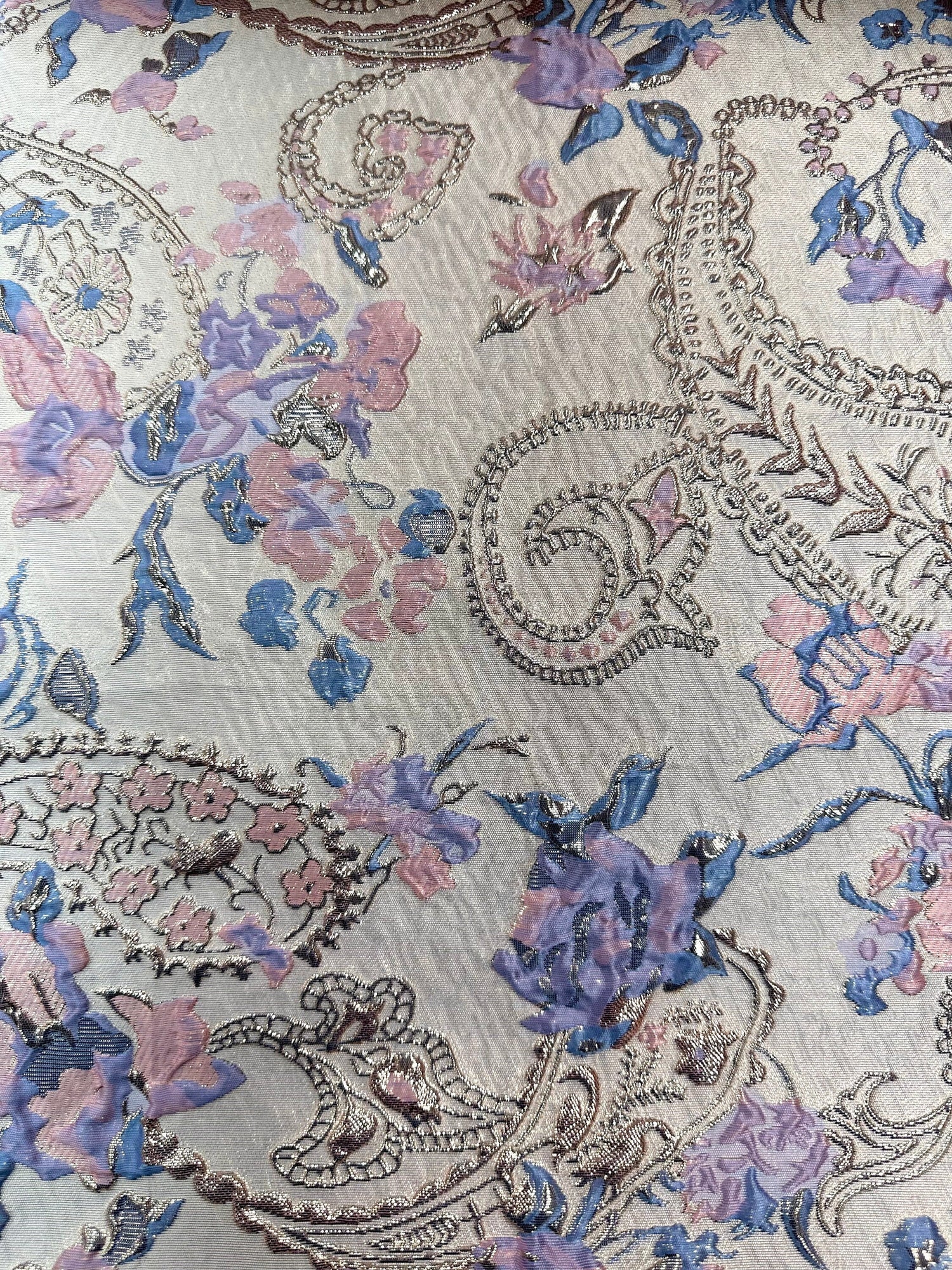 A beautiful, pink, lavender and gold, floral & paisley brocade fabric. It is great for apparel, drapery, and much more. High quality. Sold by the yard. (1 yard= 36 in.) Width is 60 in.