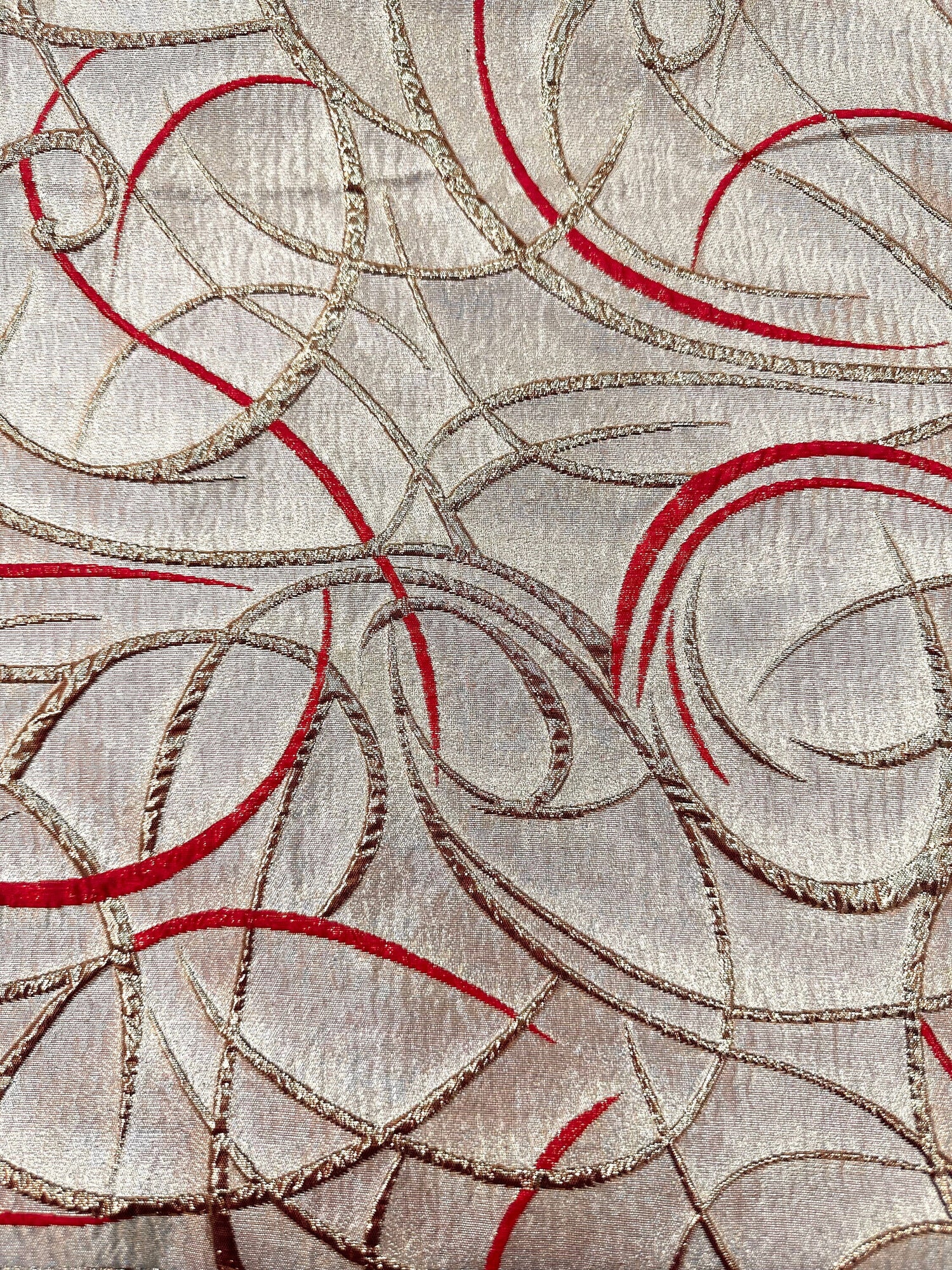 A beautiful, red and gold, swirl pattern metallic brocade fabric. It is great for apparel, drapery, and much more. High quality. Sold by the yard. (1 yard= 36 in.) Width is 60 in.