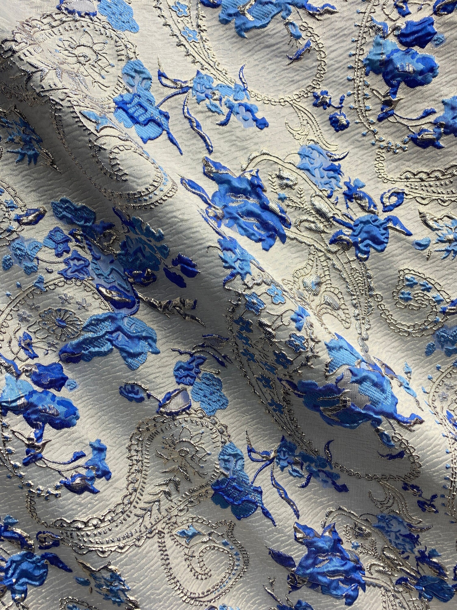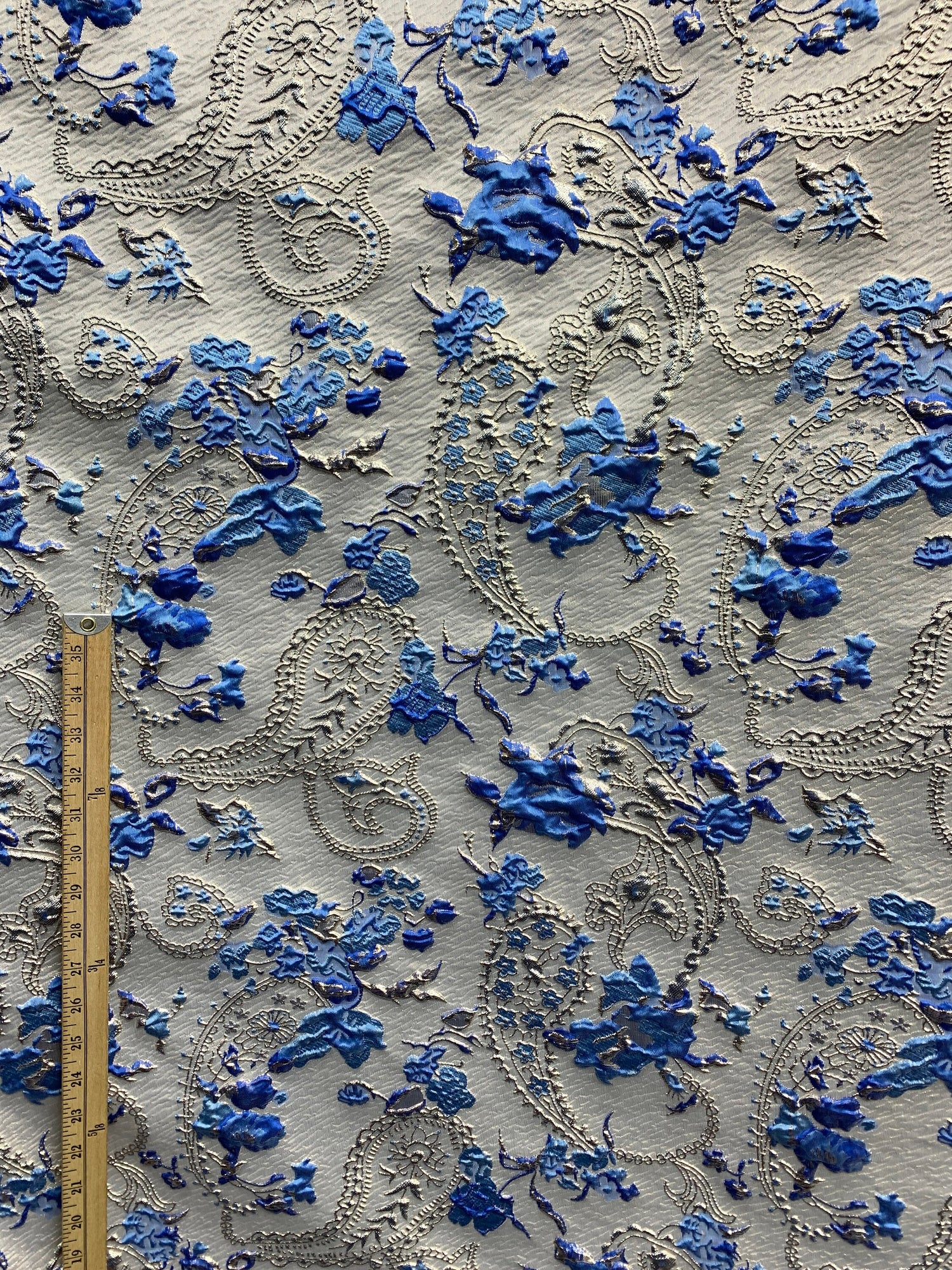 A beautiful, royal blue and gold, floral & paisley brocade fabric. It is great for apparel, drapery, and much more. High quality. Sold by the yard. (1 yard= 36 in.) Width is 60 in.