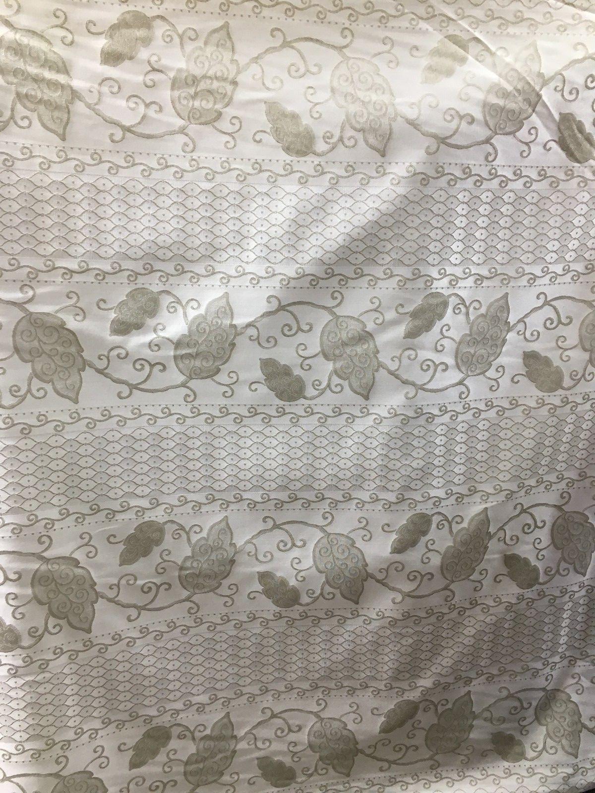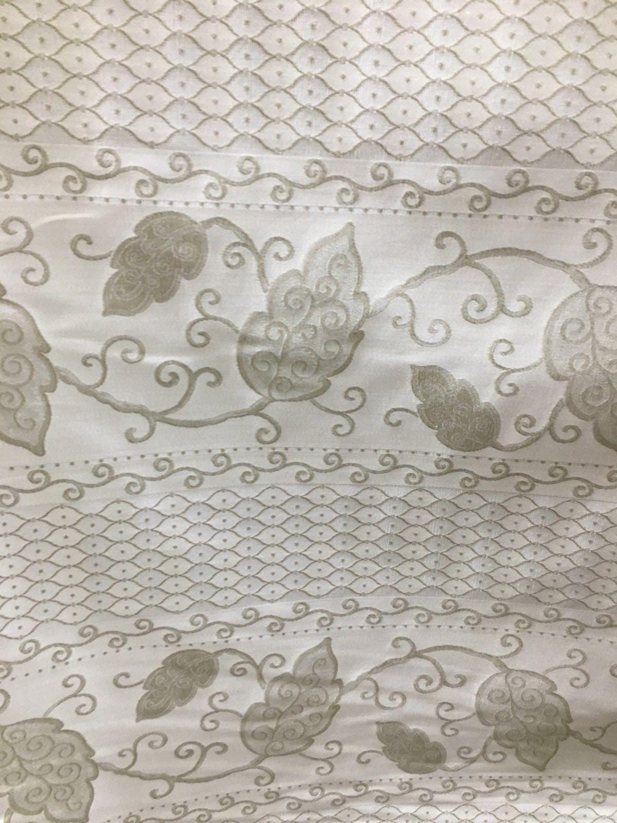 A beautiful, sage beige, upholstery and drapery brocade fabric with a floral/leaves pattern. High quality. Sold by the yard. (1 yard= 36 in.) Width is 54 in.