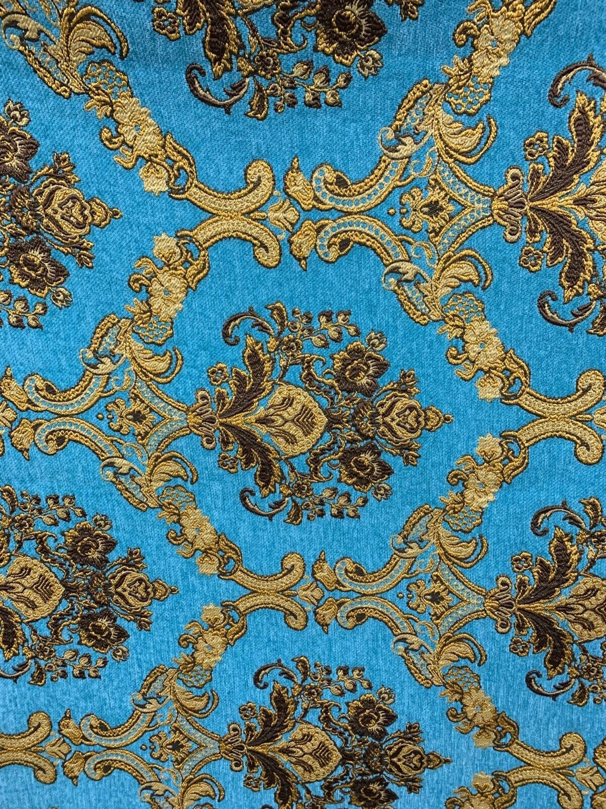 A beautiful, turquoise blue, gold, and brown, damask chenille upholstery brocade fabric with some metallic threads. Super high quality. Sold by the yard. (1 yard= 36 in.) Width is 54 in.