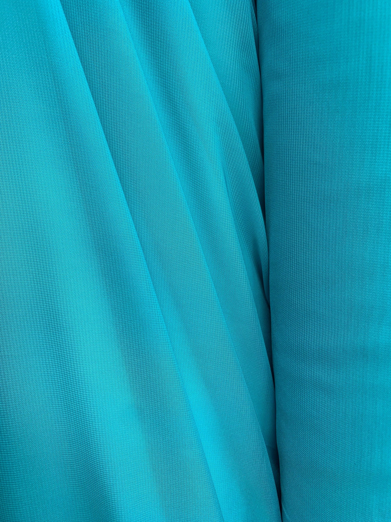 A beautiful, turquoise blue, sheer and light-weight, 100% polyester chiffon fabric. High quality and great drape. Sold by the yard. (1 yard= 36 in.) Width is 60 in.