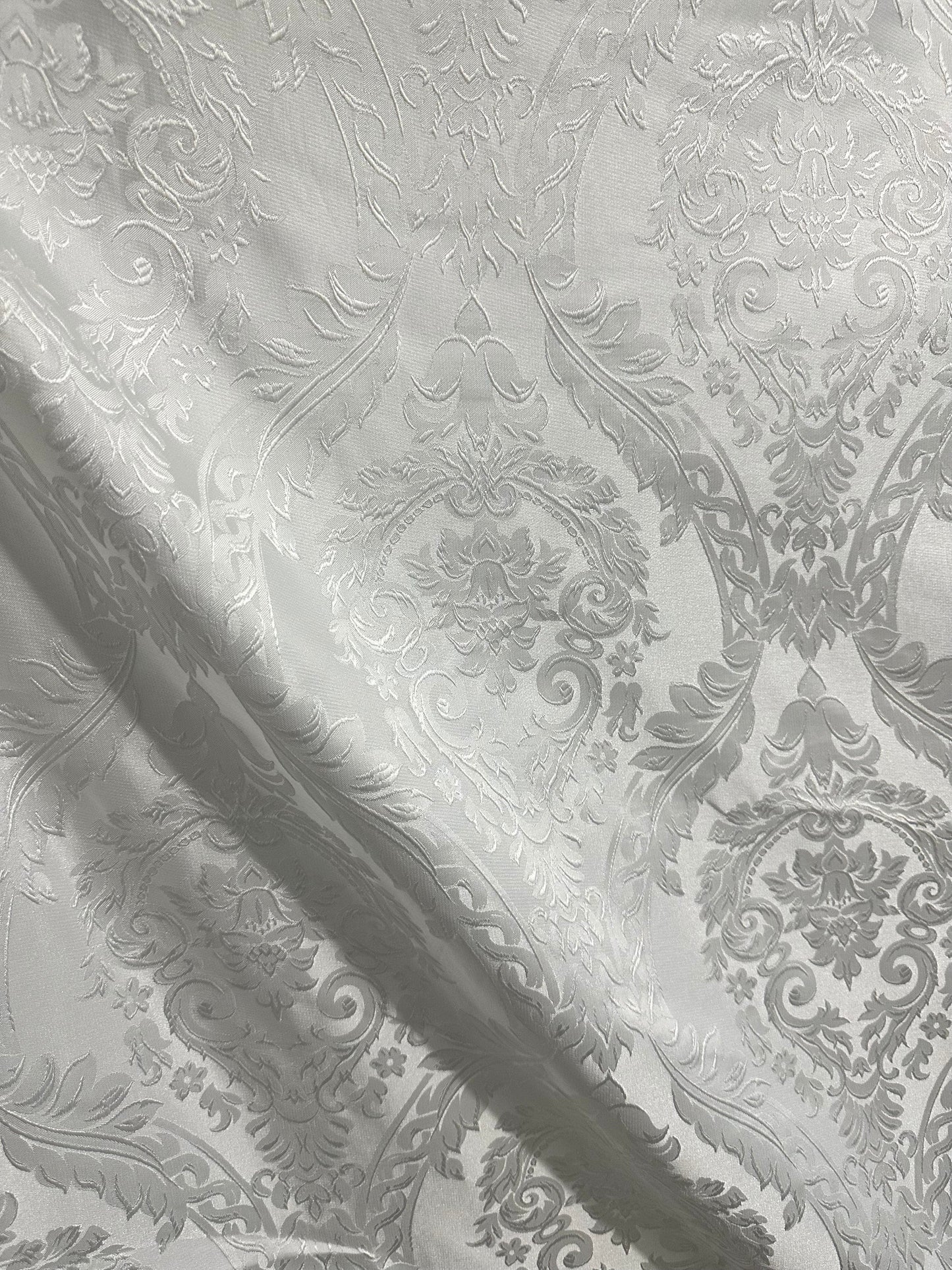 A beautiful, white, damask upholstery and drapery brocade fabric. High quality. Sold by the yard. (1 yard= 36 in.) Width is 110 in.