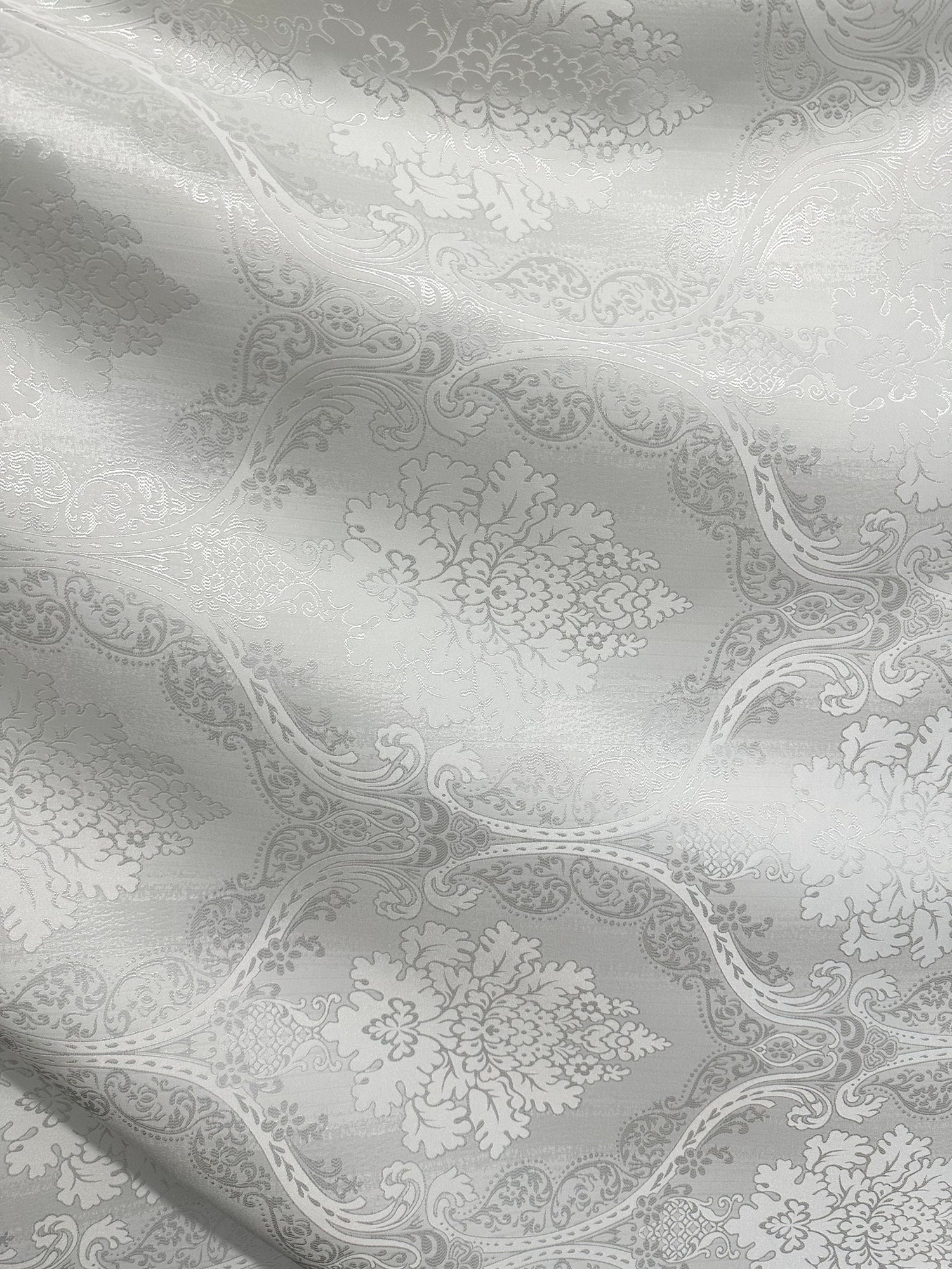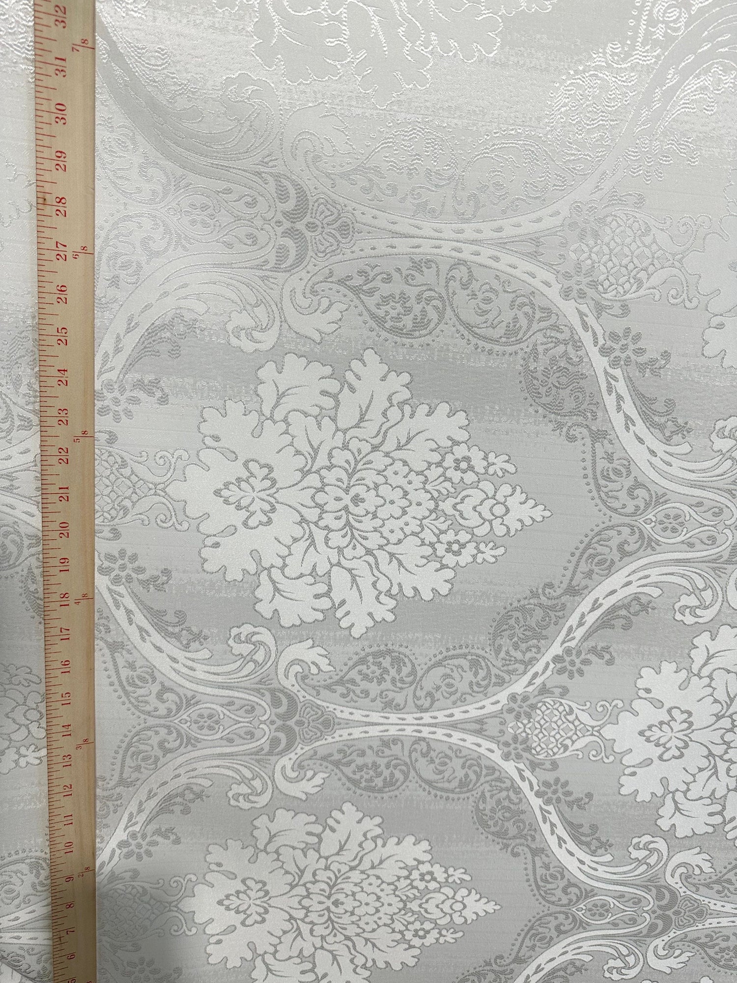 A beautiful, white, damask upholstery and drapery brocade fabric. High quality. Sold by the yard. (1 yard= 36 in.) Width is 110 in.