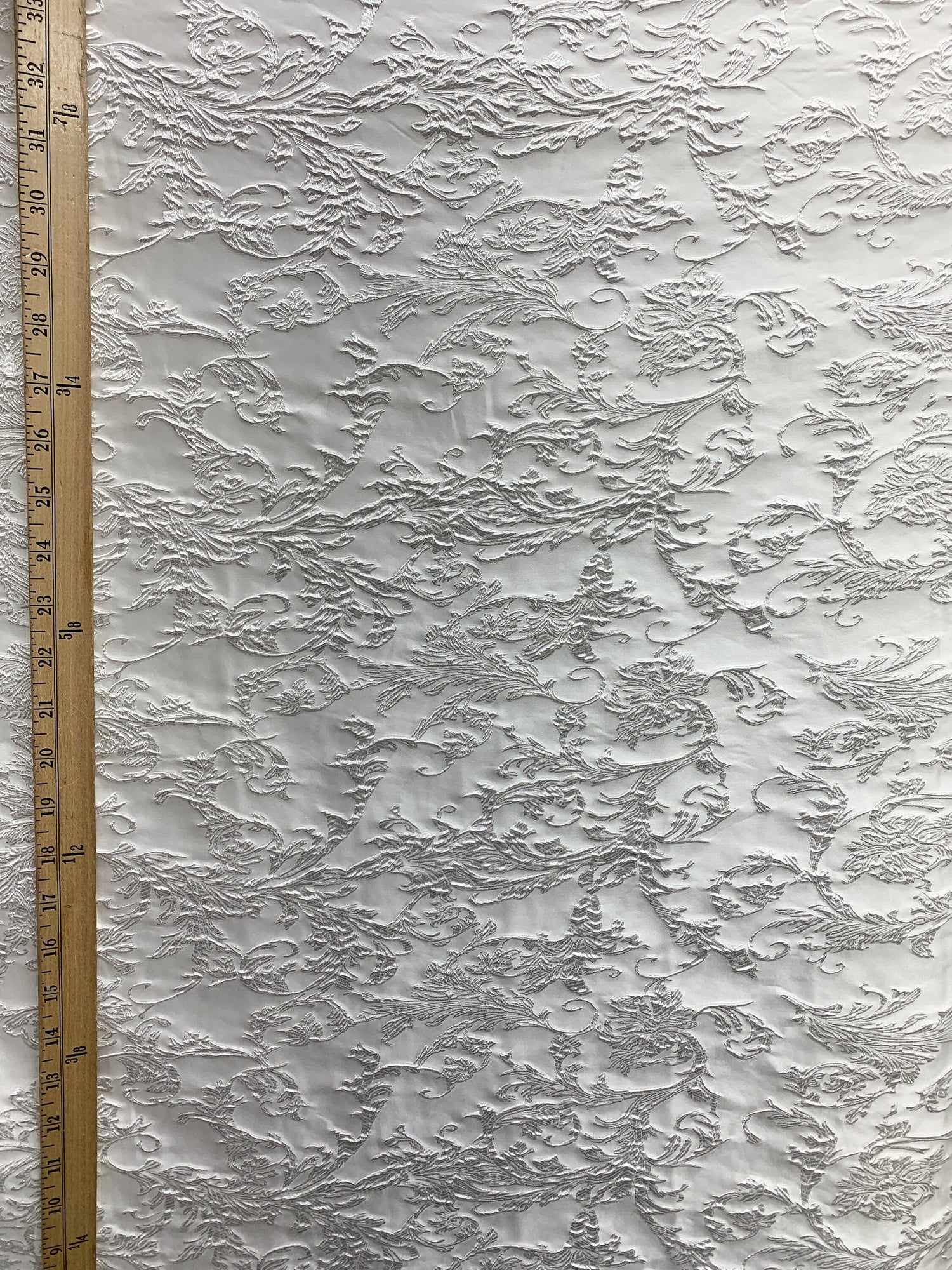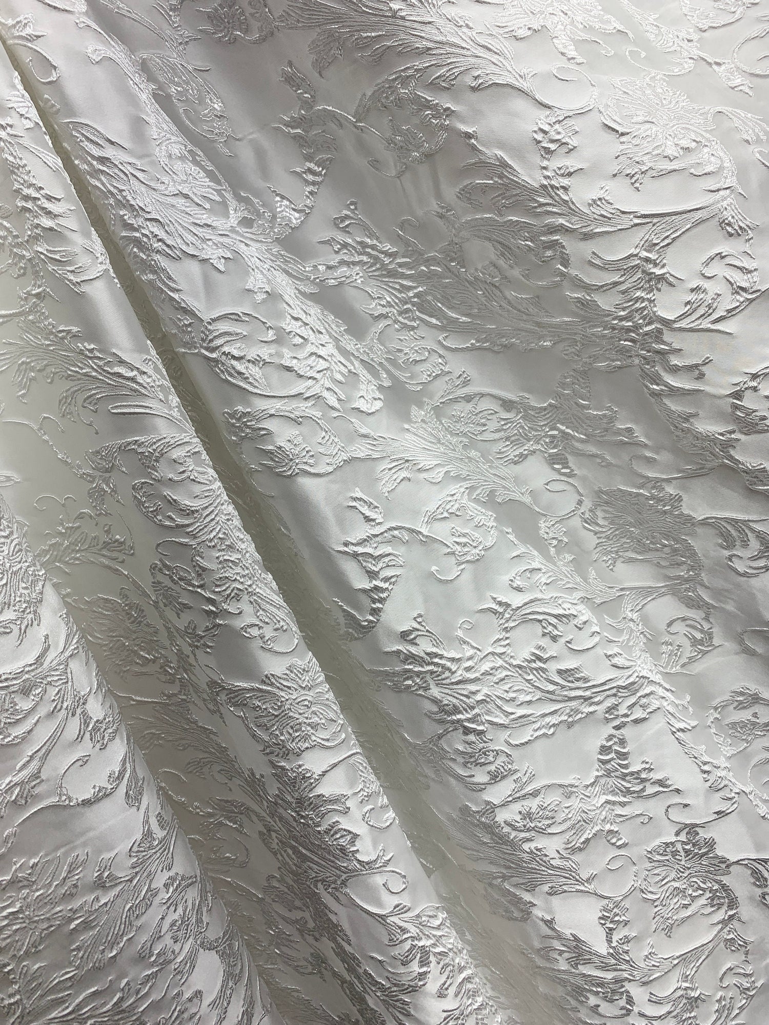 A beautiful, white, floral brocade fabric. It is great for apparel, drapery, and much more. High quality. Sold by the yard. (1 yard= 36 in.) Width is 60 in.