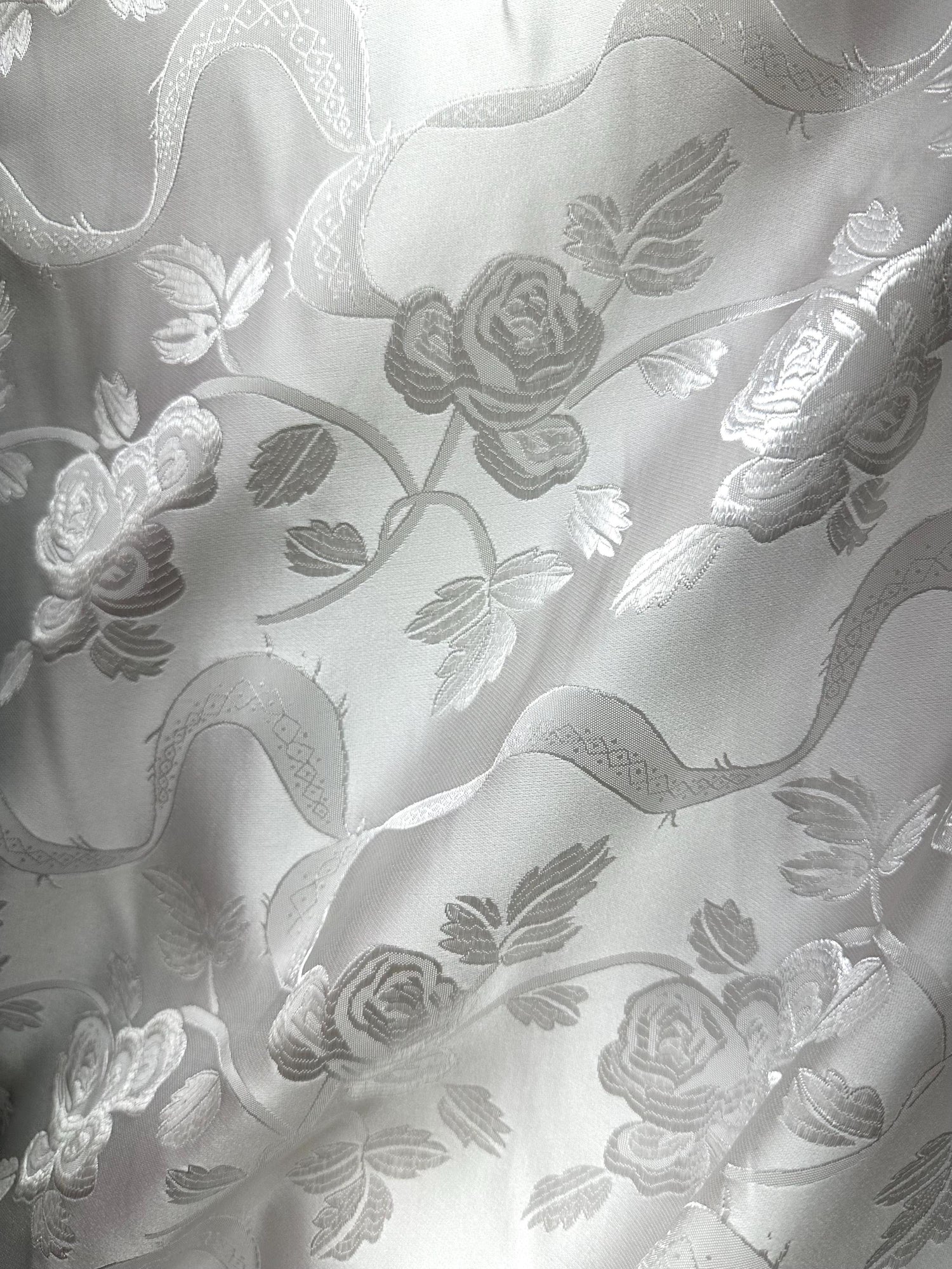 A beautiful, white, floral brocade fabric. It is great for apparel, drapery, and much more. High quality. Sold by the yard. (1 yard= 36 in.) Width is 60 in.